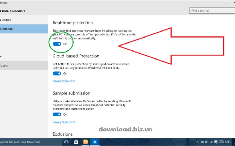 Bước 4: Tắt Real-time Protection: Trong giao diện mới, chọn Virus & Threat Protection > Manage Settings. Tại đây, bạn sẽ thấy tùy chọn Real-time Protection (Bảo vệ thời gian thực). Chuyển nút sang Off.